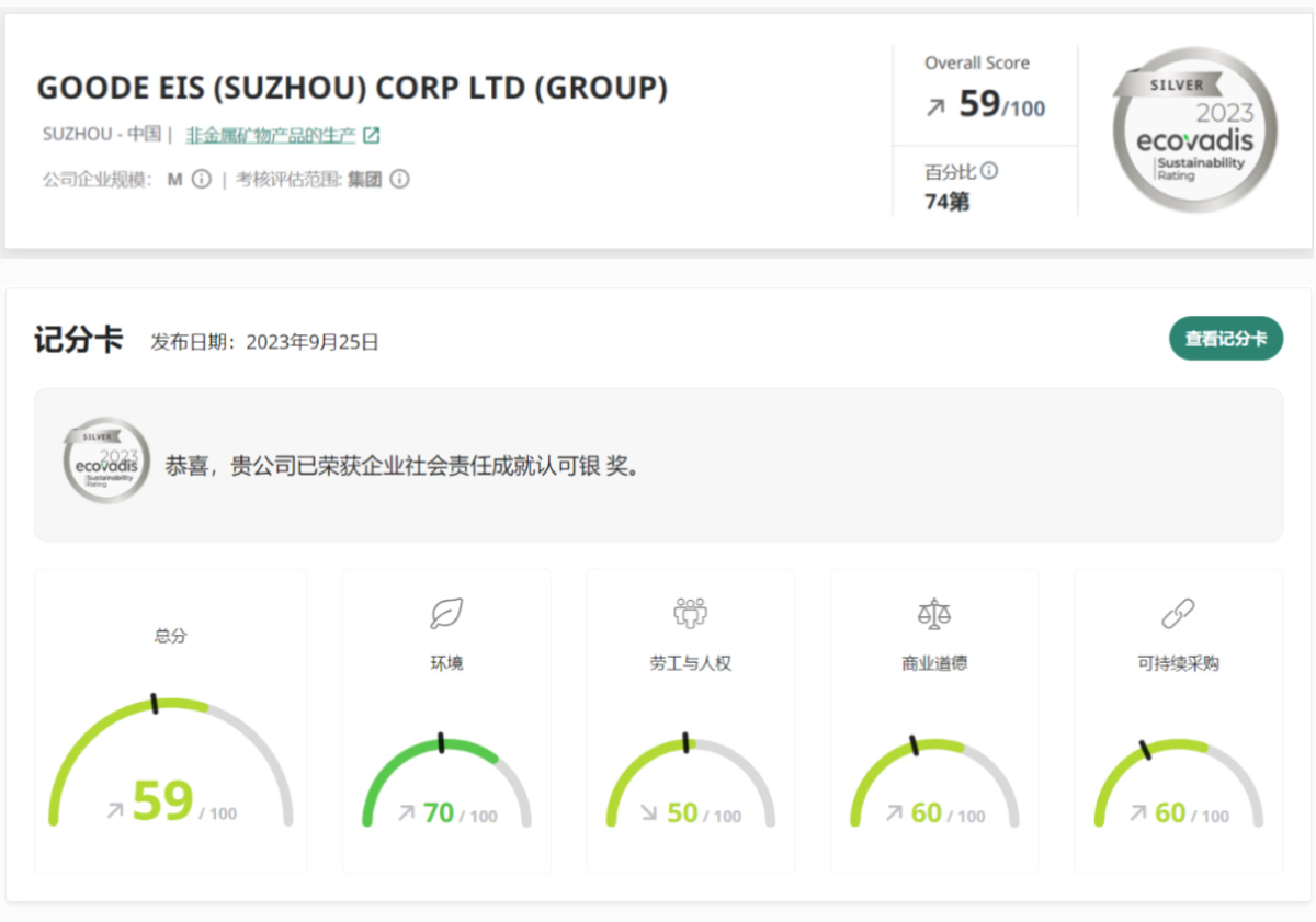 সম্প্রতি, Goode EIS (Suzhou) Corp LTD. (গুড ইলেক্ট্রিক্যাল ম্যাটেরিয়ালস) 2023 ইকোভাডিস সাসটেইনেবিলিটি সার্টিফিকেশন রেটিংয়ে 59 পয়েন্ট অর্জন করেছে এবং রৌপ্য পদক জিতেছে, বিশ্বব্যাপী মূল্যায়নে অংশগ্রহণকারী 85,000 উদ্যোগের মধ্যে 26% এবং চীনে শীর্ষ 8% র্যাঙ্ক করেছে।